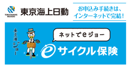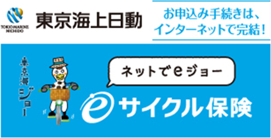 ● このウェブサイトは「eサイクル保険」の概要および保険金額(ご契約金額)・保険料等を記載したものです。ご契約にあたっては、インターネット上のお申込み画面でダウンロードいただける重要事項説明書を必ずお読みください。なお、「eサイクル保険」は、インターネットでお手続きいただける「交通事故傷害危険のみ補償特約」をセットした傷害総合保険(傷害定額条項)のペットネームです。また、詳しい補償内容については「ご契約のしおり(約款)」に記載していますので、必要に応じて、東京海上日動のホームページでご参照いただくか、東京海上日動までご請求ください。